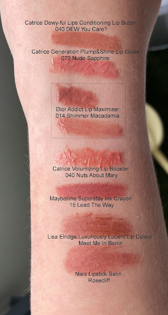 The shade is excellent nude. Not too brown, too red, too pink, too peach or too mauve. Shimmer is very fine and subtle. The lip gloss stings my lips quite strongly and for a long time when my lips are not in top condition. But a few days later there was barely any stinging when I used the gloss again.